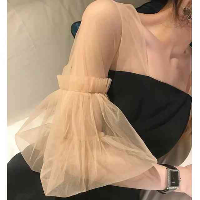 ふんわりとしたシースルーの切り替え袖が大人可愛いパーティードレスです。