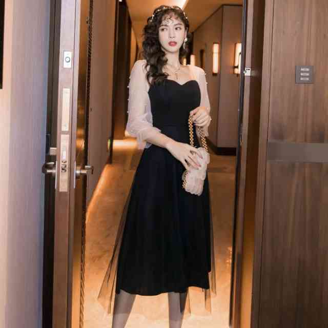 パーティードレス 結婚式 ドレス ワンピース レディース 二次会 お呼ばれ パーティー 大きいサイズ ミディアム ミディアムドレス 膝丈 膝下 エレガント フォーマル 七分丈 シースルー切り替え フェミニン パール ドッキング バイカラー