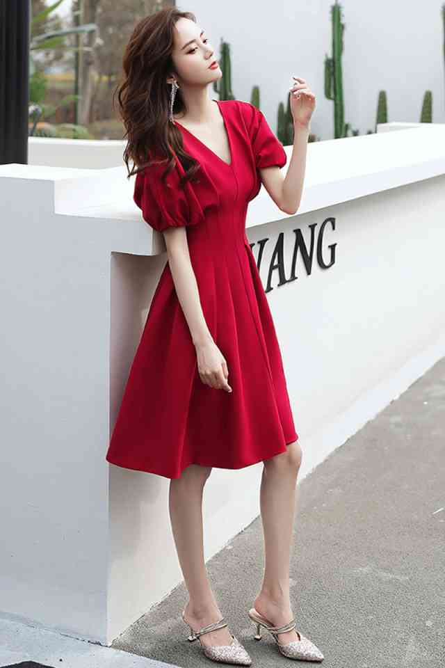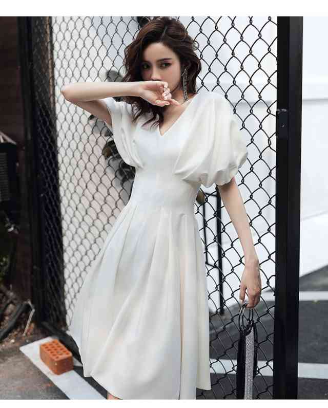 パーティードレス 結婚式 ドレス ワンピース レディース 二次会 お呼ばれ パーティー 大きいサイズ ミディアム ミディアムドレス 膝丈 膝下 エレガント フォーマル 半袖 二の腕カバー Vネック Aライン シンプル 清楚 上品 無地 20代 30代