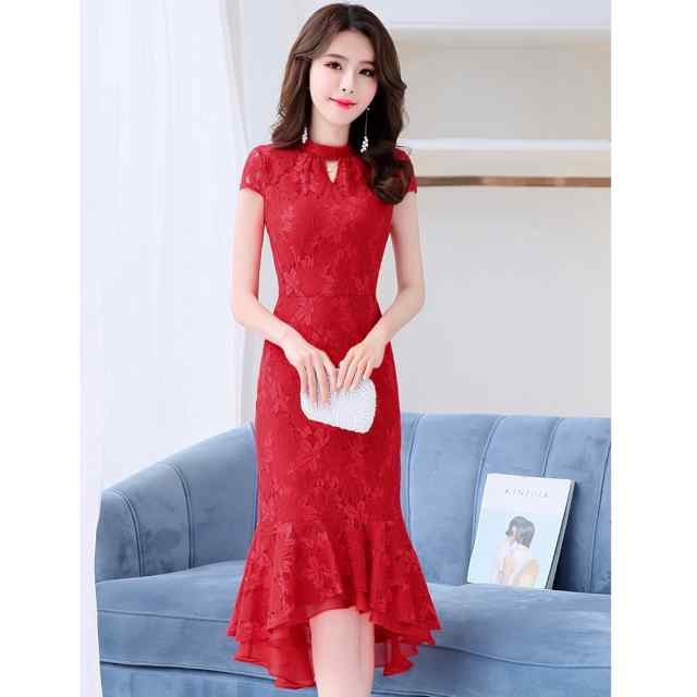 パーティードレス 結婚式 ドレス ワンピース レディース 二次会 お呼ばれ パーティー 大きいサイズ ミディアム 半袖 総レース 花柄 フィッシュテール フォーマル エレガント 上品 クラシック クラシカル 清楚 デート 大人綺麗 ミセス