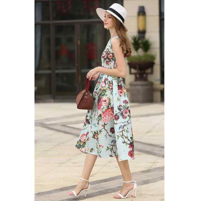 パーティードレス 結婚式 ドレス ワンピース レディース 二次会 お呼ばれ パーティー 大きいサイズ ミディアム ラウンドネック ノースリーブ 花柄 フレアスカート フォーマル エレガント 上品 クラシック 清楚 デート セレブ 綺麗 20 30